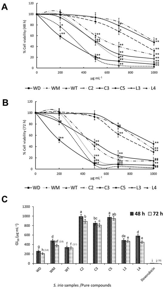 To assess the antiproliferative activity of the ethanol extracts from S. irio leaves on HT-29 human colorectal cancer cells, the MTT assay was conducted (Figure 5). Extracts from wild and cultured samples obtained under different light and salinity conditions were checked. The effects of extracts on cell viability after 48 and 72 h of treatment are shown in Figure 5A,B. The extracts from WD, WM, WT, C2, C3, C5, L3, and L4 at 1000 µg mL−1 fw and after 72 h of exposure to cells resulted in reductions of 93.1, 99.0, 97.3, 64.5, 69.7, 55.2, 65.0, and 85.4%, respectively, in cancer cell viability compared to the control group (without extract addition). Figure 5C depicts the GI50 (the dose of extracts that inhibited cell growth by 50%) of the more active samples. The GI50 of doxorubicin is also displayed. After 72 h of incubation, WD, WM, WT, C2, C3, C5, L3, and L4 showed GI50 values of 210, 380, 330, 890, 810, 950, 470, and 450 µg mL−1, respectively. The positive control doxorubicin had a GI50 of 3 µg mL−1. The SI of HT-29 versus normal CCD-18 cells was assessed after 72 h of cell exposure to extracts and pure compounds having GI50 < 400 µg mL−1, and this index was 2.8 (WM), 3.1 (WT), and 3.4 (WD) for S. irio extracts, and for doxorubicin, it was 15.
