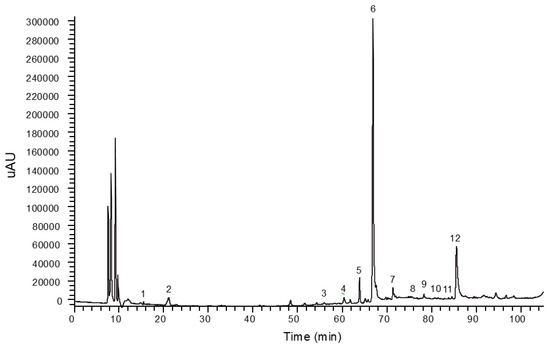 This methodology is detailed in Supplementary File S1. The analyses of phenolic compounds were conducted using the previously described HPLC system. Compounds were separated employing a gradient elution using acidified water (1% acetic acid) (A) and acetonitrile (B) as the mobile phase at 25 °C. The total running time was 105 min. A 254 nm-HPLC–DAD chromatogram of S. irio (sample WG) is shown in Figure 6, and the HPLC–DAD parameters for analysis of phenolic-rich extracts of S. irio species are detailed in Supplementary Table S3. Quantification of the compounds was accomplished using external calibration curves using pure compounds: chlorogenic acid, trans-p-coumaric acid, trans-ferulic acid, caffeic acid, luteolin, naringenin, apigenin, apigenin- 7-O-glucoside, and quercetin-3-O-glucoside.