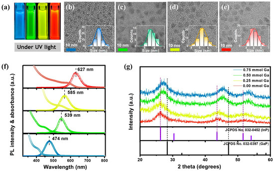 (a) Photographs of In1−xGaxP/ZnSe/ZnS QD dispersions under UV irradiation. (b–e) TEM images and histograms of size distribution obtained by varying the amount of GaI3: (b) 0.75 mmol, (c) 0.50 mmol, (d) 0.25 mmol, and (e) 0.00 mmol during core synthesis. (f) Absorbance and photoluminescence spectra of In1−xGaxP/ZnSe/ZnS QDs. (g) Powder X-ray diffraction patterns of In1−xGaxP cores.