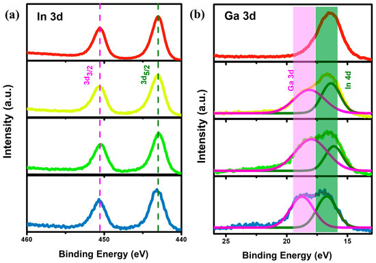 XPS high-resolution scans of (a) In 3d and (b) Ga 3d photoelectron peaks of In1−xGaxP cores synthesized using 0.00 (red), 0.25 (yellow), 0.50 (green), and 0.75 (blue) mmol of GaI3.