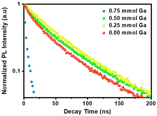 We performed time-resolved photoluminescence (TRPL) measurements on In1−xGaxP/ZnSe/ZnS core–shell QD solutions and used bi-exponential fitting to analyze the fluorescence decay (Figure 4). The PL decay lifetimes for red-, yellow-, green-, and blue-emitting QDs are summarized in Table 1. For red-emitting QDs synthesized without GaI3, the average lifetime (τavg) was 63.65 ns, increasing to 70.96 ns with the addition of 0.25 mmol GaI3 and to 70.87 ns with 0.50 mmol GaI3. The longer lifetime suggests enhanced radiative recombination efficiency attributed to moderate Ga incorporation, which likely passivates surface states and mitigates defects, as evidenced by an increase in the radiative decay rate constant (kr) and a decrease in the non-radiative decay rate constant (knr). For QDs without GaI3, kr was measured at 4.71 µs⁻¹, while knr was 10.99 µs⁻¹, indicating a predominance of non-radiative processes. Upon the addition of 0.25 mmol GaI3, kr increased to 7.05 µs⁻¹, and knr decreased to 7.05 µs⁻¹, leading to a more balanced decay pathway favoring radiative recombination. However, further increasing GaI3 to 0.50 mmol caused kr to decrease to 4.23 µs⁻¹, accompanied by a reduction in PLQY to 31%. This decline suggests that, while initial Ga incorporation passivates defects and enhances radiative recombination, excessive Ga may introduce competing defect states, diminishing its beneficial effects [12,32]. A notable deviation is observed in the significantly shorter lifetime of blue-emitting In1−xGaxP/ZnSe/ZnS QDs (6.12 ns). The significant reduction in carrier lifetime observed in blue-emitting QDs is primarily attributed to their decreased stability, which is a consequence of their high surface-to-volume ratio. TEM images in Figure 2b–e confirm that blue-emitting QDs have the smallest size compared to red-, yellow-, and green-emitting QDs. Furthermore, the blue-emitting QDs showed the poorest storage stability after synthesis, highlighting their intrinsic instability even after the shelling process. Therefore, this size-induced instability is considered the primary factor responsible for their unexpectedly short carrier lifetime. Additionally, a secondary factor may involve trap states generated by an excess of Ga or lattice strain effects, which facilitate non-radiative recombination pathways [22]. Furthermore, elevated Ga content may modify the surface composition, resulting in increased surface defects or poor passivation, effects that are particularly detrimental to smaller blue-emitting QDs. This interpretation is supported by a substantial increase in knr to 153.4 µs⁻1, indicating that non-radiative processes account for approximately 94% of the total decay.