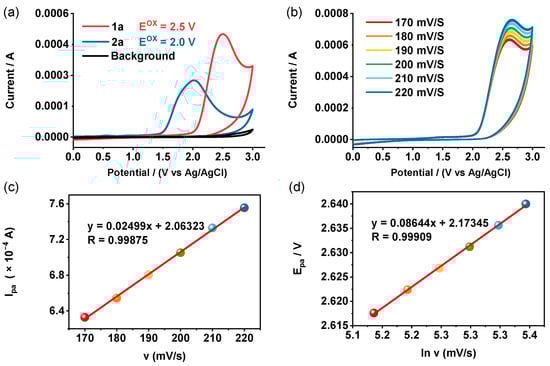 (a) The cyclic voltammetry of isochroman (1a) and indazole (2a) was measured in 0.05 M n-Bu4NPF6/MeCN using a glassy carbon (GC) disk as the working electrode, a Pt wire as the counter electrode and Ag/AgCl as the reference electrode at a 100 mV/s scan rate. (b) Cyclic voltammograms of isochroman (1a) at different scan rates. Curves were recorded at scan rates of 170, 180, 190, 200, 210 and 220 mV/s. (c) The plot of peak current vs. scan rate for isochroman (1a). (d) The relationship between Epa and lnν for isochroman (1a).