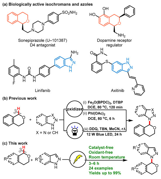 The following supporting information can be downloaded at https://www.mdpi.com/article/10.3390/molecules30010004/s1, Copies of 1H NMR, 13C NMR and 19F NMR spectra of the products are included in the Supporting Information. Figure S1–S4: Cyclic voltammetry of isochroman and indazole. Figures S5–S8: LC-MS spectrum of compounds. Figures S9–S61: 1H and 13C NMR spectra of products. Figures S62–S86: HRMS Spectra for the Products. Scheme S1: Control experiments. Table S1 and Figure S87: Crystal data and structure refinement for 3a.