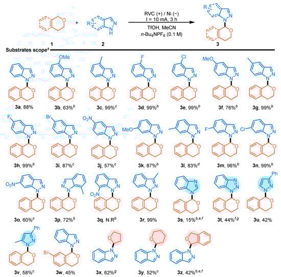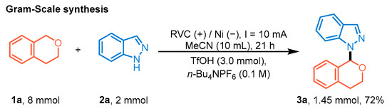 With the optimal conditions in hand, the substrates’ scope was explored (Scheme 2). In order to achieve higher product yields, the reaction conditions were slightly adjusted for several substrates. Indazoles 2 with both electron-donating and weak electron-withdrawing groups were transformed into their corresponding products in good to excellent yields (3a–i, 3k–n and 3r). Due to the strong electron-donating nature of the methoxy group, it might have become more difficult for N–H bond cleavage in compounds 2b, 2f and 2k to generate the active intermediates. This resulted in lower product yields (3b, 3f and 3k). Surprisingly, moderate yields were observed for substrates 2j and 2o, which contain strong electron-withdrawing groups. The product yield was highly susceptible to both steric hindrance (3p) and intramolecular hydrogen bonding (3q) [38]. In addition, other azoles, substituted isochroman (7-bromoisochroman) and cyclic ethers were also suitable for the reaction system (3s–3z). A gram-scale reaction afforded 3a in a 72% yield, demonstrating the potential of this electrochemical method for industrial applications (Scheme 3).