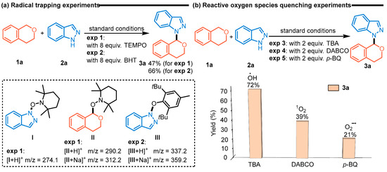 To determine the detailed mechanism of this transformation, several control experiments were carried out (Scheme 4). Initially, an excess of 2,2,6,6-tetramethylpiperidine 1-oxide (TEMPO) or butylated hydroxytoluene (BHT) could not completely inhibit this reaction (exp 1 and 2). Meanwhile, five strong molecular ion peaks were detected by LC-MS: [I + H]+ (exact mass: 274.1); [II + H]+ (exact mass: 290.2); [II + Na]+ (exact mass: 312.2); [III + H]+ (exact mass: 337.2); and [III + Na]+ (exact mass: 359.2). Triethylenediamine (DABCO) and 1,4-benzoquinone (p-BQ) as reactive oxygen species quenchers effectively inhibited the reaction (exp 3–5). The oxidation peaks of isochroman (1a) and indazole (2a) were observed, respectively, at 2.5 V and 2.0 V vs. Ag/AgCl by cyclic voltammetry experiments. It was seen that the oxidation peak currents for isochroman (1a) increased linearly with scan rates (Figure 1b,c). The number of electrons for isochroman (1a) was calculated to be one by Laviron’s method [39] (Figure 1d). These results indicated the following: (1) the reaction might have involved both a radical process and an ionic pathway; (2) the oxidation of 1a was an absorption-controlled process, and the electro-oxidation step of 1a involved a one-electron process; and (3) the singlet oxygen (1O2) and superoxide anion (O2−•) might serve as the active species for this transformation.