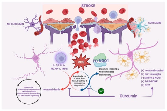 - Anti-inflammatory and antioxidant effects [59]: Curcumin exhibits potent anti-inflammatory characteristics by suppressing the activation of inflammatory pathways and diminishing the production of pro-inflammatory mediators like IL-1β (interleukin-1 beta), IL-6 (interleukin-6), MCAP-1 and TNF-α with a prominent role of the IL-1β in hypoxia-related detrimental effects [60] as well as in the progression of ischemic brain injury, contributing to neuronal damage and exacerbating stroke outcomes. Curcumin’s ability to attenuate neuroinflammation [61] may help mitigate secondary brain injury and promote tissue repair following ischemic stroke by Akt/Nrf2 pathway stimulation, upregulation of the brain-derived neurotrophic factor (BDNF) expression, and suppression of the NAD(P)H: Quinone oxidoreductase 1 (NQO1) induced by brain hypoxia [62,63,64]. By scavenging free radicals and avoiding lipid peroxidation, curcumin also functions as a strong antioxidant [65] and upregulates endogenous antioxidant enzymes like GPx1, GPx4, CAT, and SOD1 [66,67]. By reducing oxidative damage, curcumin may protect neurons from ischemic injury and promote neuronal survival.