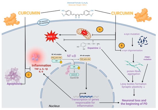 - Anti-inflammatory effects: Chronic neuroinflammation is a hallmark feature of AD, having a role in neuronal impairment and cognitive deterioration. Curcumin possesses powerful anti-inflammatory properties by hindering the activation of microglia, and the resident immune cells of the brain, and suppressing the fabrication of pro-inflammatory cytokines and chemokines, including IL-1β, TNF-α, and IL-6 [147,148,149].