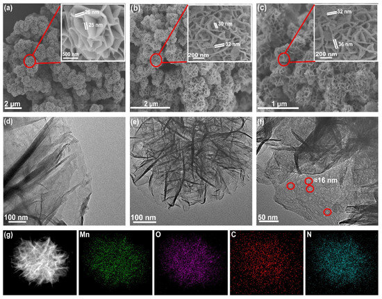SEM and TEM images: (a,d) MnO2, (b,e) PPy/MnO2 and (c,f) meso–PPy/MnO2–3; (g) EDS mapping of meso–PPy/MnO2–3. (The red circles in are used to circle the mesopores in the image, it represents where the mesopores are located).