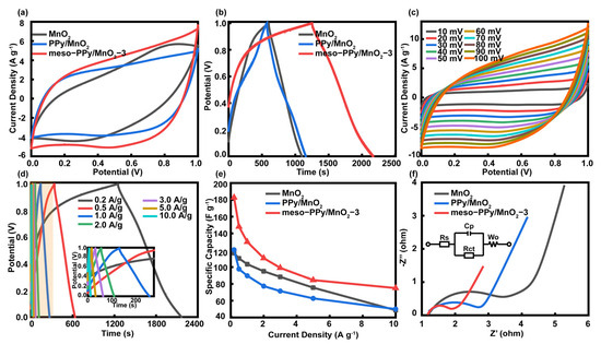 The galvanostatic charge/discharge (GCD) measurement of meso–PPy/MnO2–3 was performed at different current densities with potentials ranging from 0 to 1.0 V. At 0.2 A g−1, the GCD curve of meso–PPy/MnO2–3 was seen to have a triangular shape, which indicates that adsorption–desorption is highly reversible during charging and discharging (Figure 4b). The CV and GCD curves of the other composites are exhibited in Figure S5. Among them, the optimum capacitance of the meso–PPy/MnO2–3 electrode is 182.8 F g−1, which is better than PPy/MnO2 (120.52 F g−1) and MnO2 (116.6 F g−1) at 0.2 A g−1 current density. The specific capacitances of meso–PPy/MnO2–3 are 148.1, 130 and 110.64 F g−1 when the current density is changed in the range from 0.5 to 2 A g−1 (Figure 4d). At 10 A g−1, the capacitance of meso–PPy/MnO2–3 (79.8 F g−1) exceeded that of PPy/MnO2 and MnO2, indicating the improved capacity and rate performance of meso–PPy/MnO2–3 (Figure 4e).