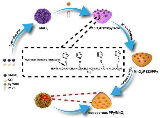 Mesoporous materials, which have a fairly high specific surface area, can afford more reaction sites, shorten mass transfer distance and facilitate ion transport in active electrode materials, significantly improving electrochemical performance [15,16,17,18,19]. Taking advantage of their high surface area and high porosity, the construction of mesoporous polypyrrole/manganese dioxide (PPy/MnO2) composites is an efficient method for improving electrochemical performance by enhancing their electrical conductivity, inhibiting the dissolution of MnO2 in neutral electrolytes and increasing the electrochemical effective area and ion accessibility of MnO2. However, the relevant literature is poor, and the synthesis of mesoporous PPy/MnO2 presents some difficulties. Tong et al. [20] successfully synthesized hollow mesoporous PPy@MnO2 composites using mesoporous SiO2 as a hard template via a low–temperature redox reaction. But there is the risk of difficult removal of the template with a hard template method. Moreover, Song et al. [21] prepared MnO2/PPy composites with typical core–shell structures by combining the redox reactions of KMnO4 and MnSO4 with the chemical oxidative polymerization of pyrrole in a segmented plug microreactor. This method reduces the size of the material from the micrometer scale to the nanometer scale. But it may be difficult to have control over the reaction kinetics in synthesis systems, which prevents PPy from being efficiently encapsulated on the surface of MnO2 [22].