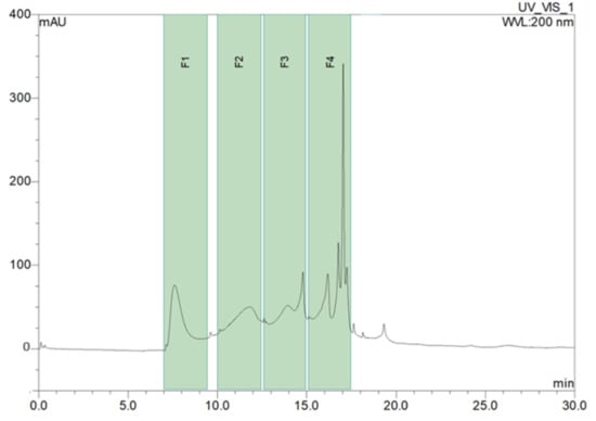 The molecular weights of pectins vary depending on the starting material and the extraction conditions. The relative molecular mass of apple pectin is approximately 122–280 kDa [,]. Therefore, 100 kDa and 30 kDa membranes were used to remove large polysaccharide molecules from the AP hydrolysate. Portions of the resulting F 02 fraction (MW < 10 kDa) were further fractionated using high-performance size exclusion chromatography (HPSEC). Figure 1 shows the molecular weight distributions of the collected fractions. Four pools were obtained: F1 (MW 3–10 kDa), F2 (MW 1–3 kDa), F3, and F4 (MW 100 Da–1 kDa).