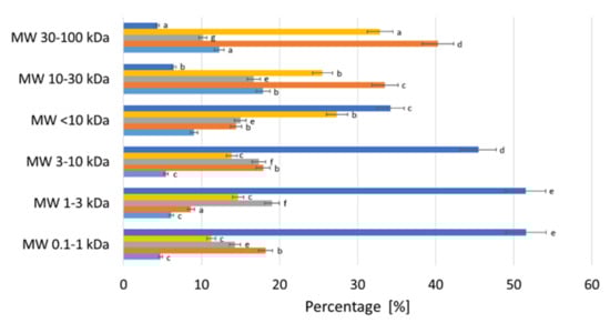 Monosaccharide compositions [%] for POS fractions with different molecular masses. All values are mean ± standard deviation (SD) for triplicate experiments. Values denoted by different letters indicate statistically significant differences between the different MW samples within the same monosaccharide type, ANOVA (p < 0.05).