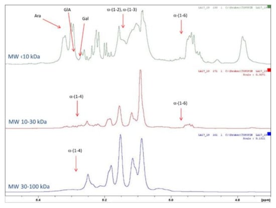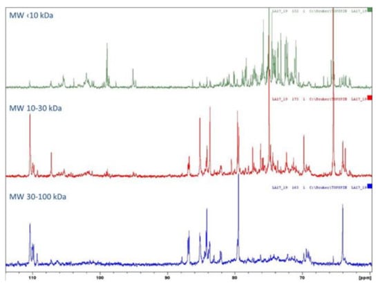 In the 10–30 kDa fraction, the 1H NMR spectrum was dominated by two signals with shifts of 3.65 ppm and 3.56 ppm, which we were unable to accurately assign to specific molecular relationships. The same relationship occurred in the MW 3–10 kDa fraction, while in the 1H NMR spectrum for the MW 10–30 kDa sample these signals had much lower intensity. This may have been due to the presence of very-high-molecular-weight compounds in this fraction. The fraction of POSs with MW in the range of 30–100 kDa was the most difficult to interpret, due to overlapping signals on the 1H NMR spectrum in the anomeric region and the small number of correlation signals on the HSQC spectrum. Due to the presence of very-high-molecular-weight compounds in this sample, we were unable to observe signals from anomeric protons derived from low-molecular-weight saccharides.
