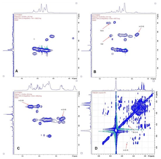 Glucosidic region of HSQC (heteronuclear multiple bond correlation) NMR of POS fractions: (A)—MW < 10 kDa; (B)—MW 10–30 kDa; (C)—MW 30–100 kDa; (D)—TOCSY spectrum of MW < 10 kDa fraction.