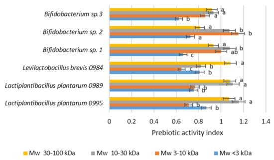 Prebiotic activity index (evaluated by comparison with untreated apple pectin). Data represent means from three replicates in one experiment. Error bars denote SD. Values denoted by different letters indicate statistically significant differences between the oligosaccharide MW samples tested within the same microorganism type, ANOVA (p < 0.05).