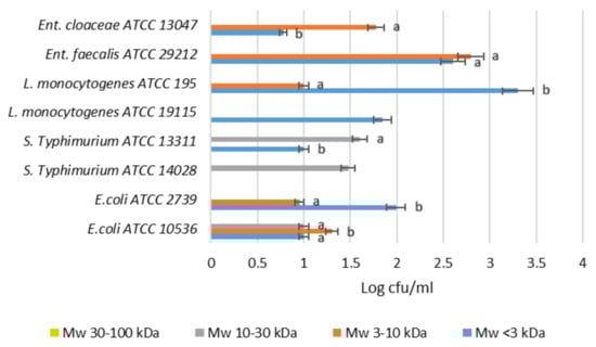 Influence of molecular mass of POSs used as a carbohydrate source on the number of cultured pathogen bacteria. Data represent means from three replicates in one experiment. Error bars denote SD. Values denoted by different letters indicate statistically significant differences between the oligosaccharide MW samples tested within the same microorganism type, ANOVA (p < 0.05).