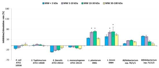 Generally, POS preparation stimulated the adherence of all lactobacilli and Bifidobacterium strains to the collagen surface. Stimulation was higher for lactobacilli strains than for Bifidobacterium, reaching up to 70% for Lactiplantibacillus plantarum ŁOCK 0981 in the case of MW 3–10 kDa and MW 10–30 kDa preparations, which were the most effective (Figure 8) (p < 0.05). The stimulation rate for Bifidobacterium isolates was weaker, reaching up to 44–46% for the Bifidobacterium 71/1/2 strain. The prebiotic preparations had little influence on the adhesion of pathogenic L. monocytogenes ATCC 19115, S. typhimurium ATCC 14028, and E. coli ATCC 10536. Even for Enterococcus faecalis ATCC 29212, which showed the highest inhibition, the results were not statistically significant.