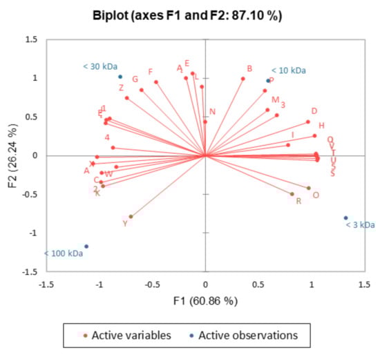 A PCA test was performed to reveal the relationship between the molecular weight of the POSs and their fermentability, as well as their simulation/inhibition of adherence and composition. By analyzing the percentages of variance, it was observed that 87.10% of the total variance was captured by only two components. The principal component (F1) contributed 60.86%, and the secondary component (F2) accounted for 26.24% of the variance (Figure 10). In the final part of the study, case classification was performed on the basis of the correlation for each PCA factor. The PCA analysis confirmed the differences in biological activity between the investigated oligosaccharides, as the four different POS fractions were distributed in different quadrants of the coordinate system. Factor F1 seemed to explain the distribution of molecular weights of the oligosaccharides. For POSs characterized with the lowest molecular weight, the content of galacturonic acid was correlated with their fermentability by pathogenic bacteria (E. coli ATCC 10536, E. coli ATCC 2739, S. typhimurium ATCC 14028, S. typhimurium ATCC 13311, L. monocytogenes ATCC 19115, L. monocytogenes ATCC 195). POSs with the average molecular weight (MW < 10 kDa, MW < 30 kDa) were explained by the F2 factor. This group highly correlated with the adherence to collagen mainly by beneficial microorganisms (L. plantarum 0981, L. brevis and Bifidobacterium ssp. 76/1/1) and pathogenic S. Typhimurium ATCC 14028, as well as the adherence to mucous (by Bifidobacterium ssp. 71/1/2, L. monocytogenes ATCC 19115). Based on the contribution and squared cosines of the variables, the F2 factor group also included fermentability by L. brevis 0984, Bifidobacterium ssp. 1, and Bifidobacterium ssp. 2.