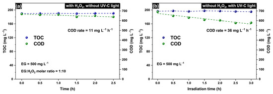 Time dependence of the TOC and COD in EG solution treated with (a) H2O2 (without irradiation) or (b) UV-C light (without the addition of H2O2).