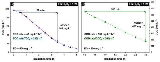 The irradiation of H2O2 with UV-C light leads to the formation of OH• radicals, which are reactive oxygen species [48]. This process is commonly referred to as the activation of hydrogen peroxide [49]. A high number of formed OH• radicals promotes the generation of many organic radicals due to their interactions with organic compounds (Figure S3). Figure 2 shows the TOC and COD plots during the experiment on EG degradation with the H2O2/UV-C system when the initial molar ratio of EG:H2O2 was adjusted to 1:25.