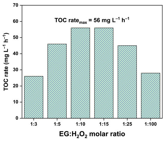 An important aspect of reaction engineering is the optimization of operating parameters to maximize the efficiency of oxidant utilization [50]. The effect of the EG:H2O2 molar ratio on the kinetics of EG mineralization was investigated on the basis of the TOC removal rate. As mentioned above, the stoichiometric ratio for the complete oxidation of EG with H2O2 is 1:5 (see Equation (1)). The results of the experiments revealed that the H2O2 amount at the stoichiometric value or lower is not high enough for efficient degradation of EG, and an excess of H2O2 is needed. Figure 3 shows that the rate of EG mineralization has a maximum of 56 mg L−1 h−1 at an EG:H2O2 ratio of 1:10–1:15. This value corresponds to the two- and threefold molar excesses of H2O2 toward the stoichiometric value, respectively.
