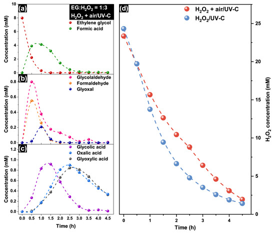 Concentration profiles of (a) EG and formic acid, (b) aldehydes, and (c) C2-carboxylic acids during EG treatment in the H2O2 + air/UV-C system (EG:H2O2 is 1:3, airflow is 1000 cm3 min−1, initial EG concentration is 500 mg L−1, initial temperature is 22 ± 1 °C); (d) comparison of H2O2 concentration profiles in the H2O2/UV-C and H2O2 + air/UV-C systems.