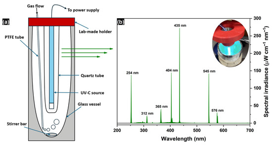 (a) Scheme of the reaction vessel (blue arrows show the vessel components, green arrows illustrate the emission from the UV-C lamp); (b) emission spectrum of the used germicidal UV-C lamp in the region of 200–700 nm (the inset shows a photograph of the lamp installed into the vessel).