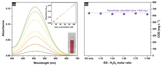 (a) Absorbance spectra of the quinoneimine dye formed in the Trinder method (different colors correspond to different concentrations of H2O2, the inset shows the calibration plot for the determination of H2O2 concentration); (b) COD values measured for MnO2-pretreated EG solutions (500 mg L−1) containing different amounts of added H2O2.