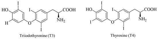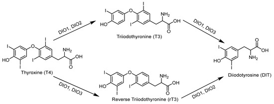 - Kuiper, G.G.; Kester, M.H.; Peeters, R.P.; Visser, T.J. Biochemical mechanisms of thyroid hormone deiodination. Thyroid 2005, 15, 787–798. [Google Scholar] [CrossRef] [PubMed]