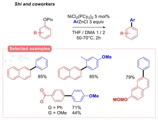 Furthermore, unlike previous reports [21,22], nickel (II) complexes were not found to be effective pre-catalysts for this reaction, presumably due to the slower generation of the catalytically active Ni(0) species from Ni(II) by the potassium heteroaryl trifluoroborate, when compared to aryl boronic acids and esters. The aryl–aryl Negishi cross-coupling of aryl pivalates was also reported by the Shi group (Figure 6) [25]. As for boron nucleophiles, the reaction of aryl zinc chlorides tolerated both naphthyl and phenyl pivalates as the electrophilic partner. Interestingly, this reaction was also found to be compatible with electrophilic carbonyl substituents, such as ketones.