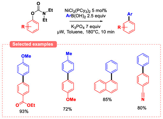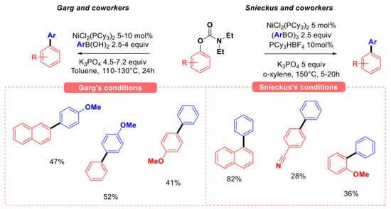 In 2009, Garg [37] and Snieckus [38] independently explored the reactivity of O-aryl N, N-diethyl carbamates in Suzuki–Miyaura coupling (SMC) conditions using a catalytic system based on NiCl2(PCy3)2 and potassium phosphate as the base (Figure 9). Garg’s group demonstrated the ability to couple phenol derivatives carbamates with aryl boronic acids, obtaining moderate yields up to 52% after 24 h. Notably higher yields were obtained when coupling naphthol derivatives. Snieckus’s group-modified version of the reaction (by replacing boronic acids with tri(aryl)boroxin as the nucleophilic partner and using PCy3HBF4 as additive) afforded slightly better yields, especially for phenyl carbamate substrates. The coupling of aryl N,N-dimethyl carbamate electrophiles with tri(aryl)boroxin was also studied later by Shi using similar conditions in dioxane as the solvent at 110 °C, obtaining para-substituted biphenyl derivatives in increased yield (62–85%) [39].