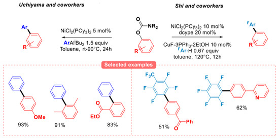 Other groups have also investigated the reactivity of aryl carbamates for developing miscellaneous C-C coupling reactions (Figure 11). Uchiyama and coworkers explored the reactivity of N,N-diethyl O-aryl carbamates with (di-i-butyl) aryl aluminum species using NiCl2(PCy3)2 as the catalyst, affording good to excellent yields of a variety of diversely functionalized biaryl compounds [42]. The direct C-H arylation of N, N-dimethyl O-aryl carbamates with perfluoroarenes was realized by the Shi group, using CuF-3PPh3-2EtOH as the co-catalyst, probably through the formation of a transient perfluoroaryl copper(I) species [43].