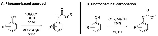 Aryl carbonates could be considered among the most promising phenol derivatives for coupling reactions, offering a good balance between reactivity and environmental friendliness [44]. Like esters and carbamates, the carbonate group is a relatively good leaving group, owing to the weakening of the aryl C-O bond due to the electron-withdrawing ability of the alkyloxycarbonyl moiety. This activation facilitates the oxidative addition step. Like carbamates, aryl carbonates have long been synthetized using phosgene or chloroformates (Figure 12A) [44]. These reagents can react with alcohols to obtain the corresponding carbonate with high yields. However, the high toxicity of these phosgene-derived reagents used for these syntheses is a major hindrance, especially for industrial applications. In addition, aryl alcohols react much slower with phosgene than alkyl alcohols, and therefore, harsher conditions (high temperatures, excess of pyridine base) are usually required to ensure the efficiency of the process. Recently, new efficient methods to synthetize aryl carbonates from phenols using a greener approach have emerged. For instance, the use of CO2 for photocatalyzed transformation of phenols (Figure 12B) [45] and trans-carbonation between aryl alcohols and dialkyl carbonates [46] are the most notable examples.
