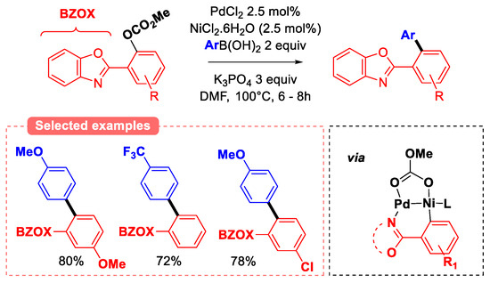 Aryl tert-butyl carbonate’s reactivity for Suzuki cross-coupling was first studied using NiCl2(PCy3)2 catalytic system and K3PO4 as a base [37]. Naphthol derivatives were converted with good to high yields, but unfortunately, no experiments have been conducted with phenol derivatives. Similarly, the cross-coupling of sterically hindered aryl carbonates with aryl boronic acids was also explored (Figure 13) [47]. The authors investigated a different catalytic approach, focusing on the use of bimetallic Ni-Pd nanoparticles and aryl carbonate substrates featuring a nitrogen chelating group (benzoxazole) ortho to the carbonate leaving group. High yields were obtained in relatively short reaction times (6–8 h), which can be explained by the dual Ni/Pd catalytic activation of the substrate via coordination of the tethered benzoxazole moiety (see Figure 13 bottom right). Indeed, it was proposed that Ni coordination to the hindered oxazolidinone enhances the rate of the rate-limiting oxidation addition step.