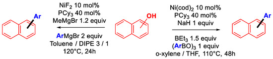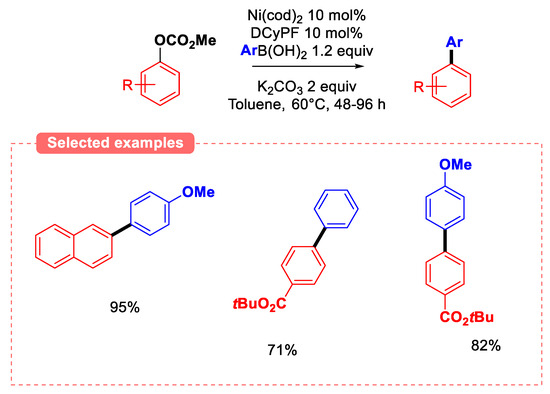Based on Garg’s conditions, a new catalytic system that allows for the coupling of coordinating group-free methyl carbonates derived from phenols was developed (Figure 14) [48]. Catalyst screening identified Ni(cod)2-DCyPF (DCyPF = 1,1′-bis(dicyclohexylphosphino)ferrocene) as the only effective complex for the coupling of para-methoxyphenyl carbonate with phenyl boronic acid. The study on other carbonate substrates revealed that the highest yields were obtained when electron-withdrawing groups were introduced at the para-position of the phenyl ring. Likewise, the presence of electron-donating substituents on the aryl ring of the boronic acid afforded high yields. However, this approach suffers from very long reaction times (typically in the 48–96 h range).