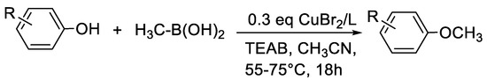 More recently, O-methylation was developed by the Cu-catalyzed oxidative cross-coupling of various phenols in the presence of methylboronic acid allowing for the corresponding aryl methyl ethers. The chosen catalytic system was CuBr2/2,2-bipyridine or 1,10-phenathroline ligand/tetraethylammonium bicarbonate (TEAB) base [66] (Figure 17).