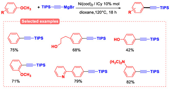 Another interesting study was reported using the same catalytic system for the cross-coupling reaction between anisoles and C(sp)−nucleophiles for the construction of C(sp2)−C(sp) bonds (Figure 19) [71]. The work was focused on using the alkynylmagnesium compound (alkynyl-MgX) generated by the reaction of ethynyltriisopropylsilane with ethylmagnesium bromide. The reaction was conducted with 2 eq. of alkynyl-MgBr in dioxane for 18 h. The steric hindrance of the triisopropylsilyl (TIPS) group proved to be crucial for the success of the reaction. It is important to note that the TIPS group can then be easily eliminated to give the corresponding terminal alkynes, which are interesting as building blocks for the synthesis of more complex molecules.