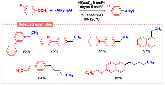 Lewis acidic nucleophilic partners have been used to lower the activation energy of C(sp2)-OMe bond breaking by prior coordination. The activation of the C-O bond by the strong and oxophilic Lewis acid trialkylaluminium was demonstrated in the alkylation reaction catalyzed by Ni(cod)2 in the presence of the dcype ligand (Figure 20). A wide variety of aryl methyl ethers were studied in this C(sp2)-Csp3 coupling reaction, and the results gave very good yields of the corresponding products. Interestingly, a natural phenol derivative such as anethole was also successfully transformed in 64% yield [73].