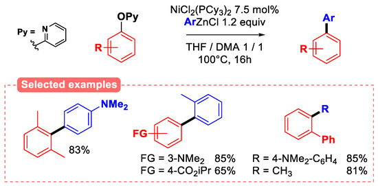 2-Pyridyl ethers have been investigated in a variety of coupling reactions, notably by the group of Zhong-Xia Wang. Indeed, the authors reported both the aryl–aryl and aryl–alkyl coupling of aryl 2-pyridyl ethers with a variety of organozinc reagents (Figure 21), using NiCl2(PCy3)2 as the catalytic system [75].