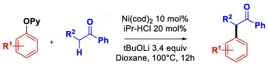 In addition, Wang’s group also reported the α-arylation of ketones with 2-pyridyl ethers using a Ni0-NHC complex as the catalyst (Figure 22) [77].