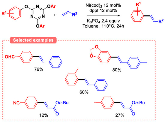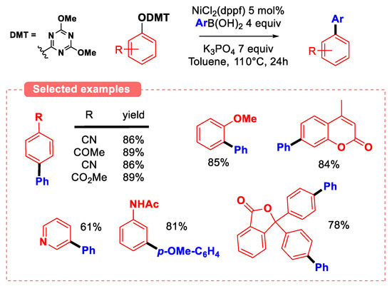 The cross-coupling of aryl triazine ethers (2,4,6-triphenoxy-1,3,5-triazine) has also been thoroughly investigated. Seminal work by Jin and coworkers using 2-aryloxy-4,6-dimethoxy-1,3,5-triazines (2-ArODMT, prepared from the corresponding phenols and 2-chloro-4,6-dimethoxy-1,3,5-triazine under basic conditions) [80] as substrates in Suzuki–Miyaura coupling revealed that that such phenolic compounds are more prone to undergo oxidative addition than 2-pyridyl ethers (Figure 24). Indeed, less σ-donor dppf ligand was used when compared to methods featuring 2-pyridyl ethers (where PCy3 or NHC ligands are necessary for the reaction to proceed). In addition, the coupling of phenyl 2-pyridyl ether with para-methoxyphenyl boronic acid afforded the desired product in modest yield (26%), whereas 2-PhODMT afforded the same product in very high yield (90%) in the same conditions.