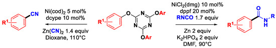 - Heravi, M.M.; Panahi, F.; Iranpoor, N. Nickel-catalyzed reductive amidation of aryl-triazine ethers. Chem. Commun. 2020, 56, 1992–1995. [Google Scholar] [CrossRef] [PubMed]