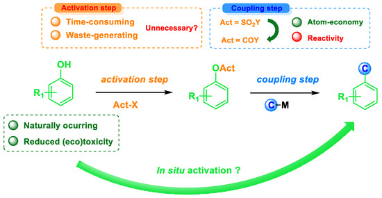 - Qiu, Z.; Li, C.J. Transformations of Less-Activated Phenols and Phenol Derivatives via C−O Cleavage. For a review on the activation of phenols. Chem. Rev. 2020, 120, 10454–10515. [Google Scholar] [CrossRef]