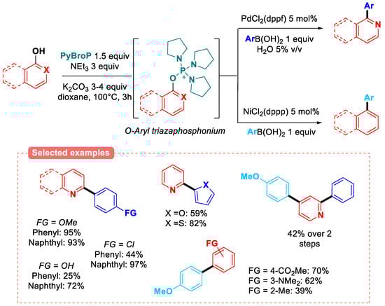 Therefore, this review will cover the recent advances in the Suzuki–Miyaura coupling using weakly activated phenolic derivatives, including the following: