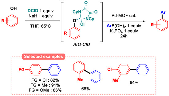 - Mokhtari, J.; Mirjafary, Z. Dichloroimidazolidinedione-activated one-pot Suzuki–Miyaura cross-coupling of phenols. Appl. Organometal. Chem. 2020, 34, e5383. [Google Scholar] [CrossRef]