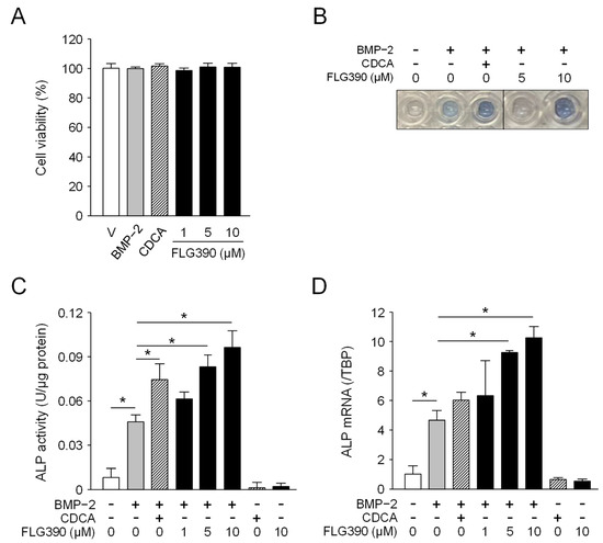 First, we investigated the cell toxicity of the FXR agonists and BMP-2 in ST-2 MSCs. CDCA and FLG390 showed no cytotoxicity up to 10 µM (Figure 2A). In addition, BMP-2 (50 ng/mL) was not toxic to ST-2 MSCs.