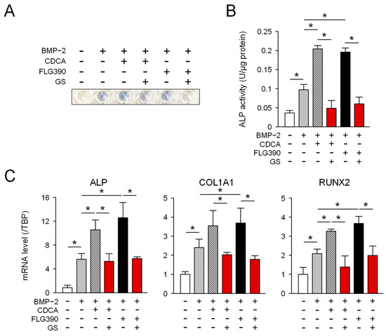 Activation by FXR agonists through FXR in ST-2 MSCs. (A) ALP staining. ST-2 MSCs were differentiated into osteoblasts for 6 d in the presence of BMP-2 (50 ng/mL) and/or CDCA (10 µM) or FLG390 (10 µM) with or without guggulsterone (GS; 25 μM). (B) ALP activity. ST-2 MSCs were differentiated into osteoblasts for 6 d in the medium containing BMP-2 (50 ng/mL; gray column) and/or CDCA (10 µM; hatched column) or FLG390 (10 µM; black columns) with or without guggulsterone (GS; 25 μM; red columns). The data are shown as the mean ± S.D. from three independent experiments. * p < 0.05. (C) Expression of the osteogenesis-related genes by BMP-2- and FXR agonist-treated ST-2 MSCs. The cells were cultured as described in the legend of Figure 3B. The data are represented as the mean ± S.D. from three independent experiments. * p < 0.05.