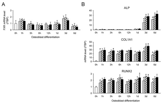 Expression of FXR and osteogenesis-related genes during osteoblast differentiation in BMP-2-induced ST-2 MSCs. (A) Expression of the FXR gene during osteoblast differentiation of BMP-2-induced ST-2 MSCs in the presence or absence of the FXR agonist. The cells were differentiated into osteoblasts for 6 d in the medium containing BMP-2 (50 ng/mL; gray columns), and/or CDCA (10 µM; hatched columns) or FLG390 (10 µM; black columns). The data are shown as the mean ± S.D. from three independent experiments. (B) Expression of the osteogenesis-related genes during osteoblast differentiation of BMP-2-induced ST-2 MSCs in the presence or absence of the FXR agonist. The cells were cultured as described in the legend of Figure 4A. The data are represented as the mean ± S.D. from three independent experiments. # p < 0.05, vs. 0 h; * p < 0.05, vs. BMP-2 alone-treated cells at each time point.