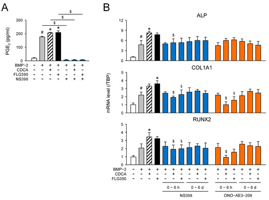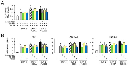 Change in expression of osteogenesis-related genes by COX inhibitors in BMP-2-induced ST-2 MSCs. (A) ALP activity. ST2-MSCs were differentiated into osteoblasts for 6 d in the medium containing BMP-2 (50 ng/mL; gray columns) with or without CDCA (10 µM; hatched columns) or FLG390 (10 µM; black columns) in the presence of each of indomethacin (1 µM; green columns), SC-560 (100 nM; yellow columns), and NS398 (1 µM; blue columns). The cells were pre-incubated with each COX inhibitor for 30 min before initiation of osteoblast differentiation. The data are shown as the mean ± S.D. from three independent experiments. # p < 0.05, vs. vehicle; * p < 0.05, vs. BMP-2 alone-treated cells in each treatment. $ p < 0.05, vs. BMP-2- and FLG390-treated cells. (B) Expression of the osteogenesis-related genes. ST-2 MSCs were cultured as stated in the legend of Figure 6A. The data are presented as the mean ± S.D. from three independent experiments. # p < 0.05, vs. vehicle; * p < 0.05, vs. BMP-2 alone-treated cells in each treatment. $ p < 0.05, vs. BMP-2- and FLG390-treated cells.