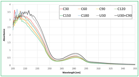 Eight extracts (C30, C60, C90, C120, C150, C180, U30, and U30+C90) were selected for UV-Vis analysis. Selected extracts were diluted in methanol (HPLC grade, Honeywell, Charlotte, NC, USA) to 0.33% concentration, placed in quartz cuvette (thickness—1 cm), and analysed using Specord 50 single-beam spectrophotometer (Analytik Jena AG, Jena, Germany). A blank sample containing only methanol was used as a reference and spectra of all extracts were processed with blank subtraction using WinAspect 2.3.1.0. software (Analytik Jena AG, Jena, Germany). Absorbance values were compared for the wavelength range 205–355 nm (no peaks observed for higher wavelengths).